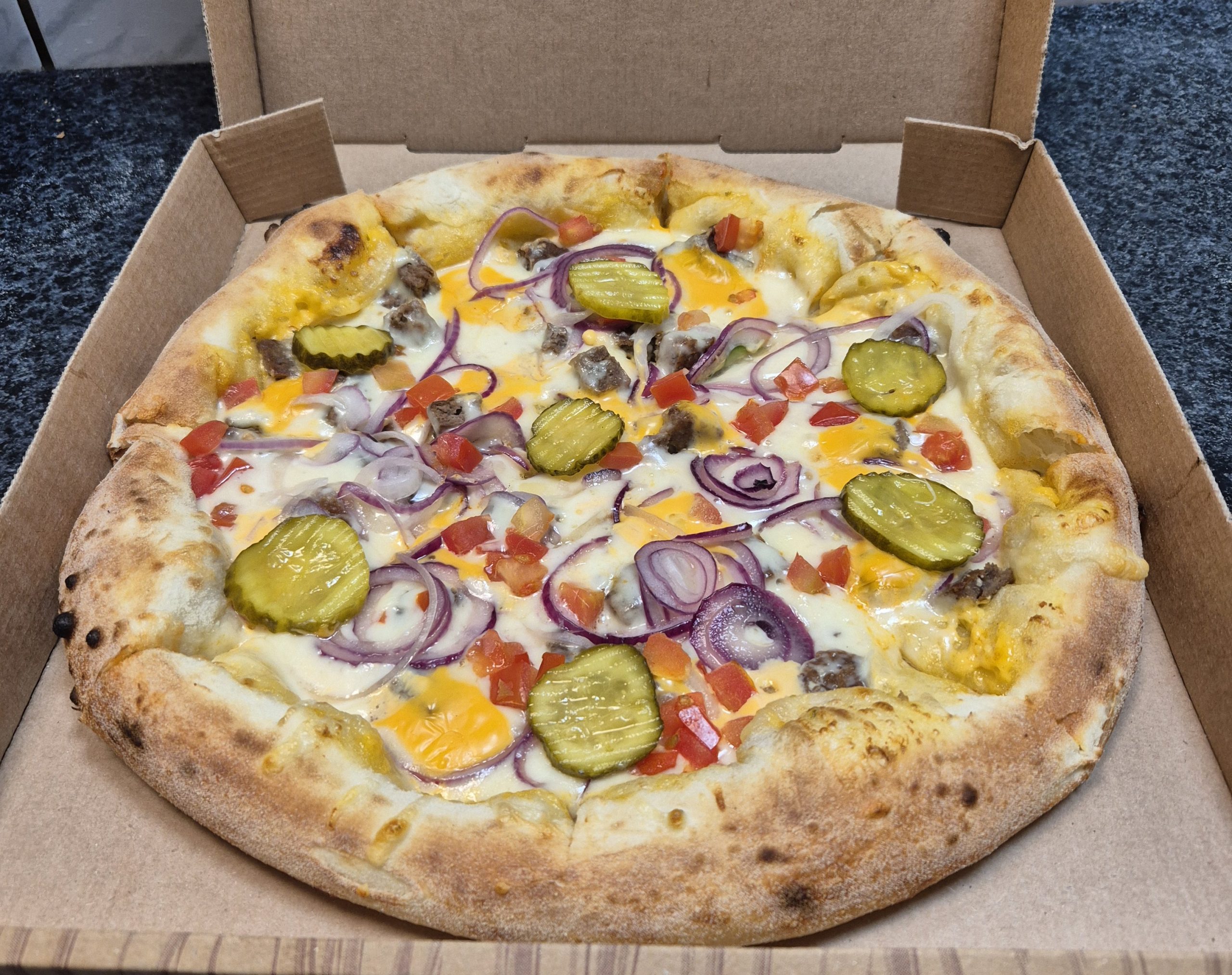 hamburgerszósz alap, 86% marha hamburgerhús, cheddar, paradicsom, csemegeuborka, hagyma, sajt