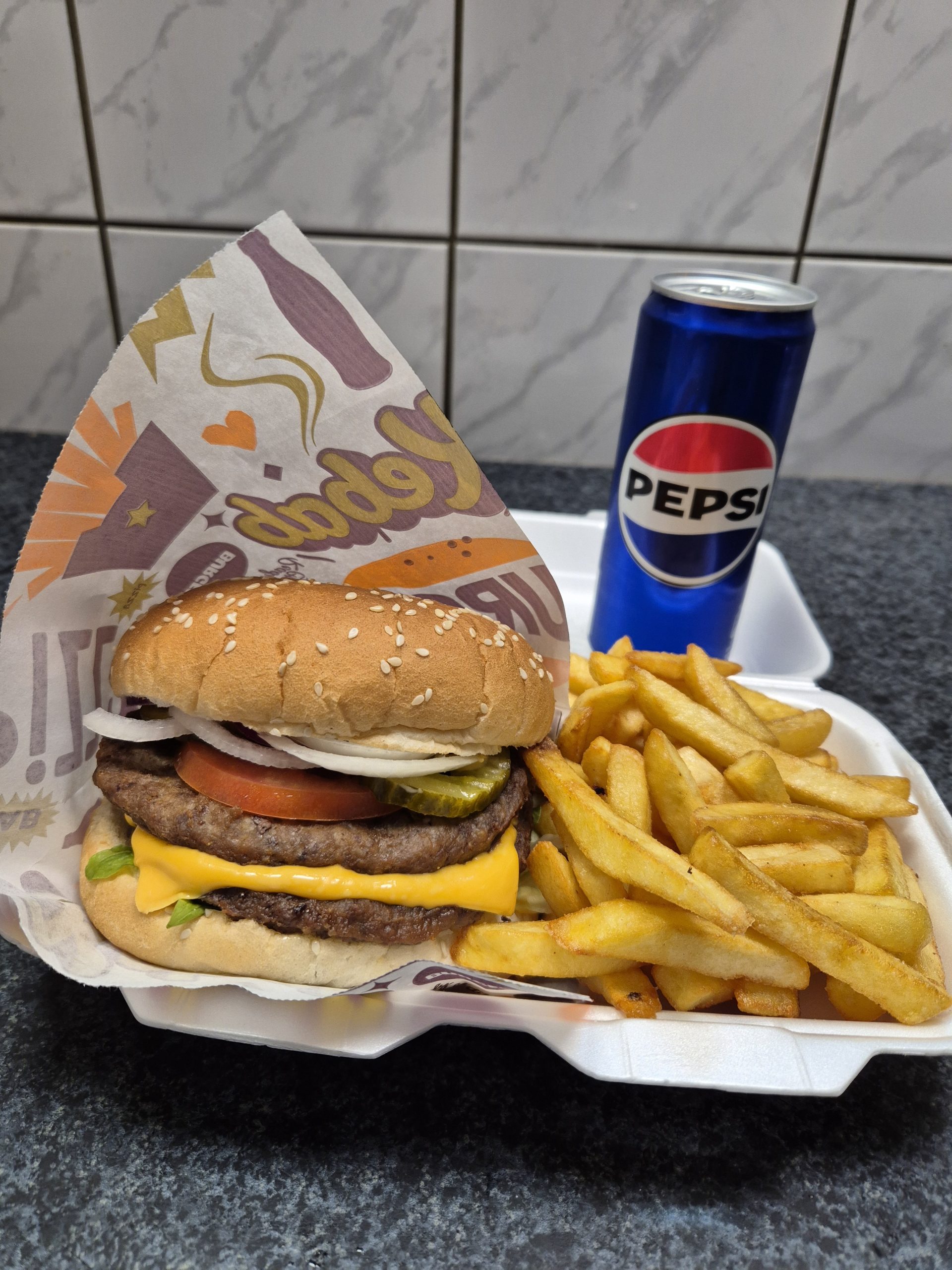 hambiszósz, dupla 86% marhús pogácsa, jégsali, pari, cs.ubi, hagyma, cheddar sajt, kis adag hasáb, 0,33 L Pepsi